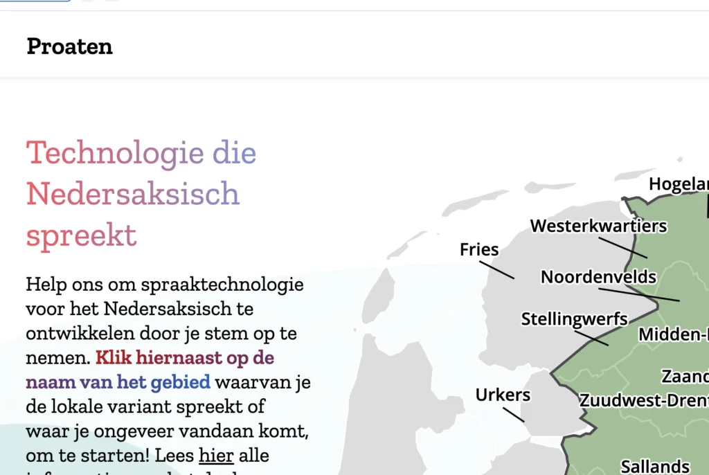 Spreek jij Nedersaksisch? Dan kun je vanaf 31 maart jouw stem doneren via het online platform proaten.nl. Dit initiatief van hoogleraar Martijn Wieling van de Rijksuniversiteit Groningen (RUG) wil bijdragen aan de ontwikkeling van spraaktechnologie voor onder andere het Drents, Gronings, Stellingwerfs, Twents, Veluws en Achterhoeks. Voor welke variant zijn de meeste sprekers te mobiliseren? En wie zorgt er als eerste voor dat een uitspraak als “pien ien mien pokkel” ook voor mensen die geen Nedersaksisch spreken met een telefoon op zak begrepen wordt?