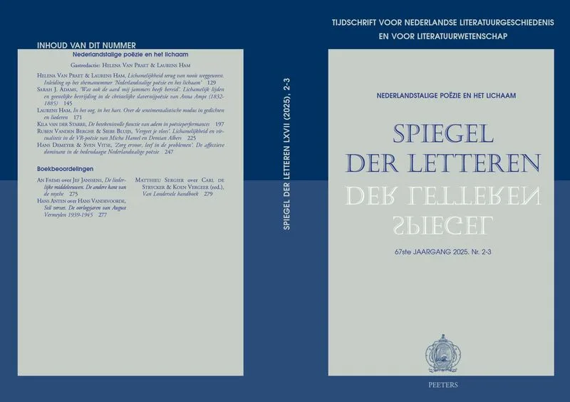 Met een prachtige dubbelnummer over Nederlandstalige poëzie en het lichaam – met als gastredacteurs Laurens Ham en Helena Van Praet – sloten we jaargang 2025 van Spiegel der Letteren af. Het nummer bevat artikelen van Sarah J. Adams, Laurens Ham, Kila van der Starre, Ruben Vanden Berghe & Siebe Bluijs, Hans Demeyer & Sven Vitse en boekbesprekingen door An Faems, Hans Anten en Matthieu Sergier. Dit alles is uiteraard ook online te raadplegen via de website van Peeters.