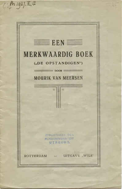 In de zomer van 1927, dus al vóór zijn tweevoudige bespreking in NU, ‘debuteerde’ Van Meersen met Een merkwaardig boek (‘De Opstandigen’), een brochure van zes pagina’s over een roman van Jo van Ammers-Küller, geschreven in februari 1927 en verschenen bij ‘Wils’ in Rotterdam en al aangekondigd in NRC van 9 april.