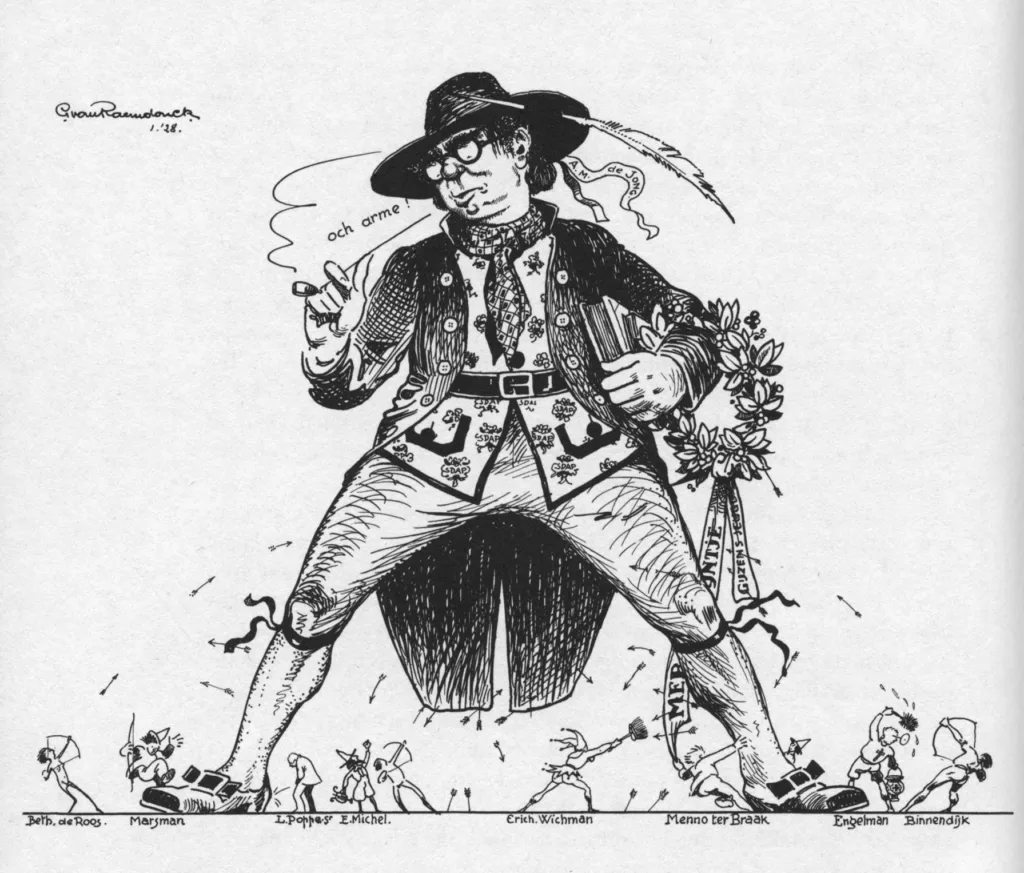 Zijn geciteerde reactie op de aNti-schUnd-affaire sloot De Jong af met: ‘ik ben uitermate benieuwd wat mijn goede vriend Dirk Coster tot deze dingen zal te zeggen hebben!’. Welnu, die liet zich inderdaad horen, en niet zo mals ook: ‘Weer deze vervloekte geest van verachting zonder reden, ongelimiteerd geloof aan zichzelf en de kleine groep rond zich […] de Heer De Jong heeft eenvoudig de moeite niet genomen, zich van de geestelijke waarde en structuur zijner tegenstanders ook maar eenige rekenschap te geven. — Slaan maar, en gelijkhalen’. (D. Coster, ‘De Anti-Nu beweging’, De Stem 8 (1928) 318-28, geciteerd uit: M. de Jong, A.M. de Jong…, 236) En De Jongs vriend George van Raemdonk, zijn tekenende kompaan bij Bulletje en Bonestaak, reageerde met een even kritische caricatuur in De Notenkraker, die door De Gemeenschap als direct betrokken partij met graagte werd overgenomen. (In De Notenkraker, 4-2-1928, en De Gemeenschap 4 )1928) 2 (feb.), 104, met dit bijschrift: ‘Hoe het socialistische carricaturenblad “De Notenkraker” met ongemeenen geest de actie tegen de misdragingen des heeren De Jong in beeld bracht. De schaalverhouding der figuren is volkomen zuiver als ons vermoeden juist is, dat den teekenaar de oplaagcijfers der uitgaven van den heer De Jong en die van ons door het hoofd hebben gespeeld (om niet te vergeten de verhouding tusschen de honoraria van dezen democraat en die van ons akelige bourgeois-zoontjes, opvreters der meerwaarde, verdedigers van de brandkast etc. etc….. Maar dit is natuurlijk pure afgunst).’)