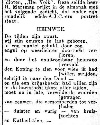 Expliciet viel De Jong tot slot Marsman aan. Eerst lacht hij — wel wat terecht — een beetje over diens klacht over diens eigen portret om vervolgens diens bijdrage ‘Heimwee’, enkele woorden hieruit citerend, aan Erts aan te vallen: ‘onze tijd zou er niets aan verloren hebben als u per ongeluk “eeuwen vroeger geboren” waart.’ Hij ergert zich tamelijk pietluttig aan geen hoofdletter na een punt en toont zich dan ‘blij, dat ik niet met u in hetzelfde boekje sta, zo ongemanierd mogelijk. Ik voel me niet thuis in de duffe kelder van uw heimwee naar het verre verleden, die dichterlik zijn wil, maar enkel op impotentheid wijst, hoor, beeldt u maar niks in.’ (A.M. de Jong, ‘Letterkundige Kroniek CCXLIV’, Het Volk, 13-6-1927)