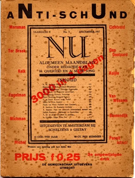 De Jong en Querido konden niet nalaten om uitgebreid te reageren op het aNti-schUnd-pamflet. In ‘Heibel in het straatje. Een woord van verweer’ roept hij badinerend: ‘Ja, ik kan het heus niet helpen, maar het machteloze herrietje rond “Nu” in ’t algemeen en mijn welhaast staatsgevaarlijke persoonlijkheid in ’t bizonder werkt aan het eind van alles toch alleen maar op mijn lachspieren. Ik zie daar deze diep beklagenswaardige heer Binnendijk, in de luren gelegd Nederlands dichter, met bleek gelaat ontdaan staan huilen om de snoodheid van die brutale lummel uit dat gezin van de nieuwe buren waar “Nu” op de deur staat, waarna later zijn verweer volgt. Daarna doet ook Querido een duit in het zakje en serveert Binnendijk af als een ‘niet ongevaarlijk querulant’.(A.M. de Jong, ‘Heibel in het straatje. Een woord van verweer’, NU 1 (1927/28) 6 (mrt), 132-45, hier 134; Is. Querido, ‘”De Vrije Bladen” en zijn uitgever. Een kleine verklaring’, ibid., 146v )In beide stukken echter geen woord over Van Meersens bijdragen!