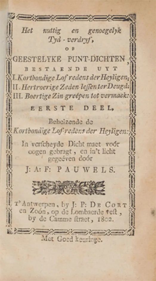 Zo kun je je wagen aan Het nuttig en genoeglyk tyd-verdryf, of geestelyke punt-dichten (1802) van Jan Antoon Frans Pauwels (1747–1823). In zijn tijd stond hij bekend als ‘de Poëet Pauwels’. Pauwels wordt soms beschouwd als de Antwerpse stadsdichter avant la lettre; hij schreef honderden gelegenheidsverzen over Antwerpen en haar inwoners. In zijn puntdichten – korte, geestige gedichten met een strak rijmschema – verheerlijkte hij humanisten, schilders en schrijvers zoals Anna Bijns. Pauwels betreurde de culturele situatie tijdens het Franse regime en kleedde zich ook naar die mening: in de stijl van het Oostenrijkse regime, compleet met een gepoederde pruik. Hem een opvallend figuur noemen, is dus geen overdrijving. Zijn gedichten hadden vaak een moralistische inslag en moedigden lezers aan tot een deugdzaam, christelijk leven.