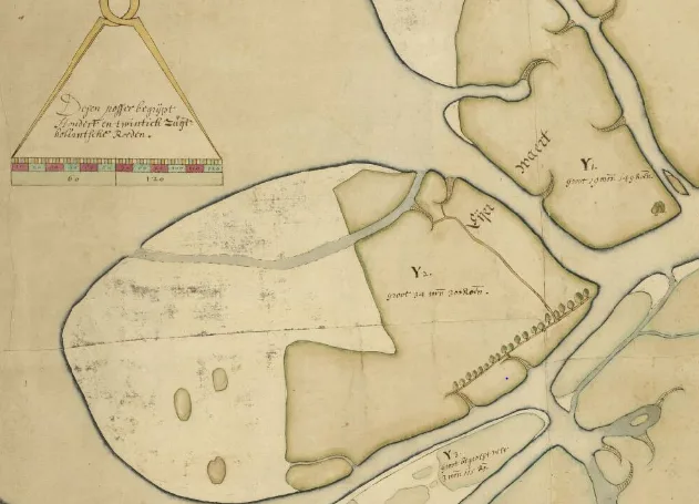 Bron: Nationaal Archief, kaart 4. VTH 2012 a Kaart van den Eijerwaard, Krakeelwaard, Kalverwaard, {…) en Japenwaard 1643 Een momentopname van een ei-vormige waard in wording?