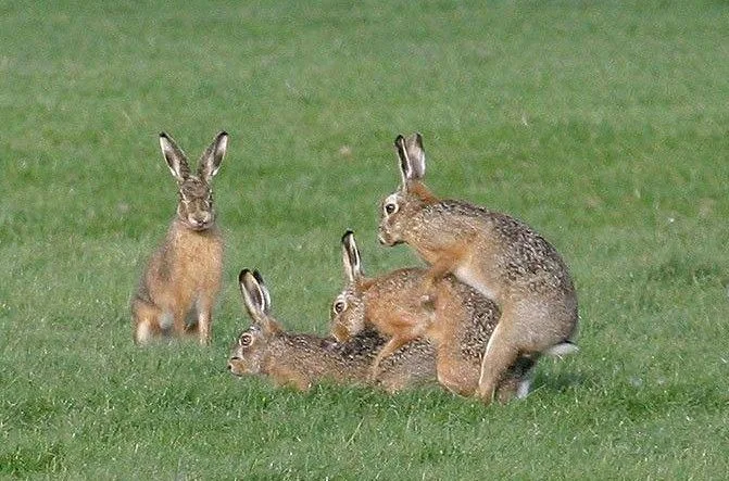 Hazen protesteren zelf niet zo gauw. Dus doe ik het maar namens hen. Tegen de foto boven een tekst over fuckende konijnen.