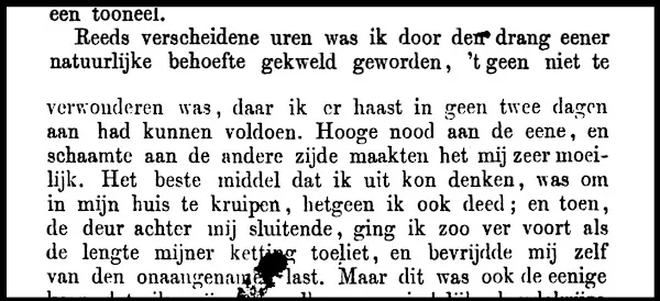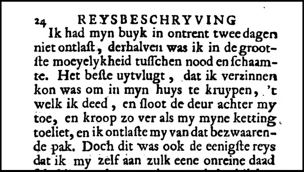 1727: Ik had myn buyk in ontrent twee dagen niet ontlast, derhalven was ik in de grootste moeyelykheid tusschen nood en schaamte. Het beste uytvlugt, dat ik verzinnen kon was om in myn huys te kruypen, ’t welk ik deed, en sloot de deur achter my toe, en kroop zo ver als my myne ketting toeliet, en ik ontlaste my van dat bezwaarende pak.
