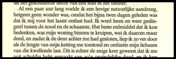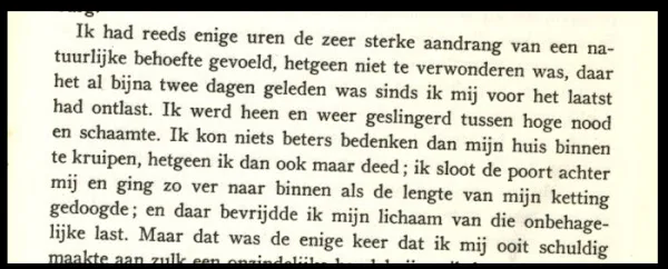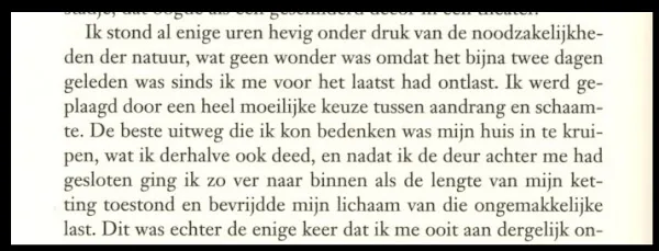 1974: Ik had reeds enige uren de zeer sterke aandrang van een natuurlijke behoefte gevoeld, hetgeen niet te verwonderen was, daar het al bijna twee dagen geleden was sinds ik mij voor het laatst had ontlast. Ik werd heen en weer geslingerd tussen hoge nood en schaamte. Ik kon niets beters bedenken dan mijn huis binnen te kruipen, hetgeen ik dan ook maar deed; ik sloot de poort achter mij en ging zo ver naar binnen als de lengte van mijn ketting gedoogde; en daar bevrijdde ik mijn lichaam van die onbehagelijke last.
