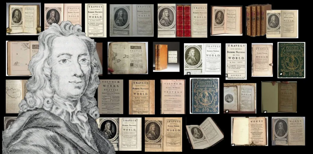 1727: anoniem [Dr. Cornelis van Blankesteijn]; 1792: anoniem; 1862: J.W.N. Mosselmans; 1940: G. Blom; 1974: Mr. S[em] Davids; 1979: Arjaan van Nimwegen; 2004: Paul Syrier. Zie ook blog 565 en 566 voor een inleiding op deze serie vertaalproblemen. Illustratie: Lemuel Gulliver in zijn bibliotheek, voor de wand met schilderijen van zijn lotgevallen.