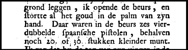 Nog een realium: Gulliver is inmiddels in Brobdingnag, bij de reuzen – hoewel die nergens zo genoemd worden: het woord Giant komt maar twee keer voor, één keer in verband met de afmetingen van Brobdingnagianen in lang vervlogen eeuwen, volgens de mythen en sagen, en één keer als Gulliver weer thuis is en zichzelf een Giant waant en zijn gezin Pygmies – en haalt ten overstaan van de boer die hem gevonden heeft zijn beurs leeg, met six Spanish-pieces of four Pistoles each, besides twenty or thirty smaller Coins. Een pistool was een gouden munt, inzonderheid de Spaanse kroon en de Franse louis d’or. Een vertaling moet een beetje realistisch overkomen, zelfs al begrijp je er niets van: het moeten algemeen bekend veronderstelde begrippen zijn. 1862 heeft zes Spaanse stukken in ieder van vier pistolen en daaraan lees je het omschrijvende af, net als het zes Spaanse stukken van vier pistolen van 1974 en 1979. Je kan natuurlijk uitwijken naar dukaten, zilveren stukken van acht (‘pieces of eight’), dubloenen enzovoort, maar je kan pistolen ook laten staan. 1792 heeft zes Spaanse matten (mat: oud Spaans zilveren geldstuk ter waarde van acht realen), wat ik een goede oplossing vind, alschoon het zilver is en geen goud. 1940 doet een kleine uitbreiding, die ook authentiek overkomt, want daar zijn het zes Spaanse matten, vier gouden kronen en nog twintig of dertig kleinere munten – al moet je bij gouden kronen dan niet aan gebitsprothesen gaan denken natuurlijk, en is twintig of dertig ook al te automatistisch vertaald, ik zou zeggen twintig tot dertig, twintig à dertig of een stuk of dertig. 2004 heeft het nietszeggende zes Spaanse muntstukken, waarbij je je gaat afvragen wat Gulliver met Spaans geld moet. Ik denk dat ik de vertaling van 1727 volg, zes vierdubbelde spaanse pistolen, enigszins herspeld tot zes vierdubbele Spaanse pistolen.