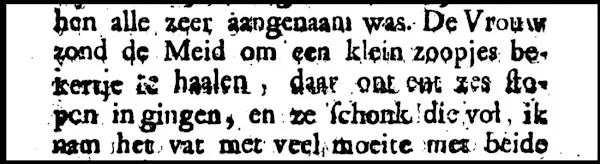 Nog een realium: bij de boerenfamilie van Brodbdingnag krijgt Gulliver te drinken uit a small Dram-Cup, which held about two Gallons. Ook hier geldt: de vertaling moet niet alleen kloppen, min of meer althans, in elk geval wat afmetingen betreft, maar ook overtuigend zijn en geen omschrijving. 1727 heeft het ontegenzeggelijk de spijker op zijn kop slaande een klein zoopjes bekertje, daar ontrent zes stopen in gingen, ook al weet je niet wat een stoop is of een zoopjes-bekertje. 1792 daarentegen is meer omschrijvend met een klein glaasje, waar in echter nog vier kannen vogt gingen. Bovendien haalt echter de grap eruit, die erin gelegen is dat het juist met een uitgestreken gezicht geënumereerd wordt, zonder van ôh en âh te gaan over hoe groot alles is. 1862 is niet echt bijzonder met zijn klein likeurglaasje, waar wel zeker twaalf flesschen in gingen. Ik probeer het ook met stopen, maar wat is een stoop? Een stoop – zulke dingen moet je weten als vertaler, of anders zoek je ze maar op – is één zestiende anker, dat wil zeggen, als je dat beter begrijpt, twee kannen of mingelen, tesamen ongeveer twee liter, dus in het zoopjes-bekertjen van 1727 past zes maal twee is twaalf liter. Dat is een beetje meer dan in het Engelse glaasje kan, want een Gallon is viereneenhalve liter, wat de maat dus negen liter moet maken. Damn. Zijn er geen andere inhoudsmaten voor vocht die bruikbaar zijn? Hoewel, misschien heb ik daar niets aan. De lezer moet zich wel een voorstelling, liefst onmiddellijk, kunnen maken over de bijsterheid van de afmetingen, en dat verlies je met buitenissige inhoudsmaten als stopen en kannen en mingelen. Daarom reken ik alle voorkomende Feet en Yards ook om in meters, want anders heb je geen enkel beeld. (Okshoofden laat ik daarentegen wel staan, zolang je je daar maar een groot vat of fust bij voorstelt.)
