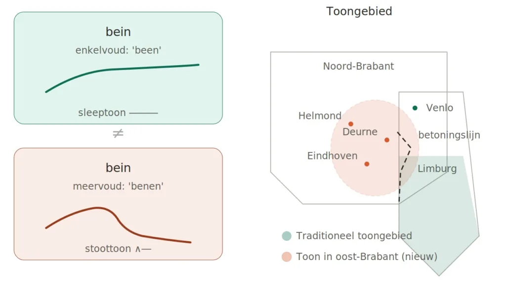 Limburgse dialecten zijn bijzonder in het Nederlandse taalgebied. Een van de meest opmerkelijke kenmerken is het toonsysteem. In Limburgse dialecten kun je bijvoorbeeld betekenisonderscheid maken door alleen maar de toon van de klinker aan te passen. Bekende voorbeelden zijn zaege voor ‘zagen’ en voor ‘zegen’ en bein dat zowel ‘been’ als ‘benen’ kan betekenen. Hoewel de vorm van het woord bein hetzelfde is, verschilt het in toon om het betekenisverschil tussen enkelvoud en meervoud aan te duiden: het enkelvoud heeft een sleeptoon, het meervoud een stoottoon (ook wel valtoon genoemd).
