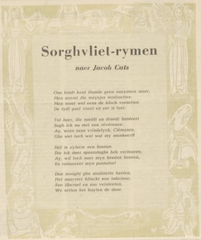 Over de naamsverandering van naaister naar modinette verscheen in het tijdschrift Burgerrecht; orgaan van het Comité Burgerrecht ter Bestrijding van Overmatige Overheidsdwang het volgende gedicht, geïnspireerd op de zeventiende-eeuwse dichter Jacob Cats:
