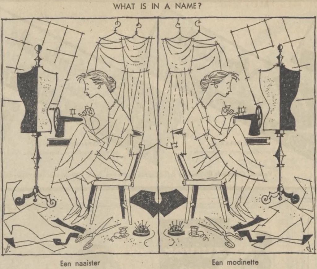 Naaister is een goed Hollands woord dat door een ieder wordt begrepen. Wil men preciseren dan zegt men costuumnaaister. Als er dan toch iets nieuws, iets deftigers, bedacht moet worden dan is ‘modinette’ wel de ongelukkigste keuze. Nederlands is het zeker niet, Frans evenmin. Waar haalt men zulke nonsens vandaan! (Modiste is wel gangbaar maar heeft meer betrekking op vervaardigsters van dameshoeden.) En dan die rangnummering 1 t.m 4. Een slechte beurt voor de voorlichtingscommissie der confectiebedrijven in Amsterdam.