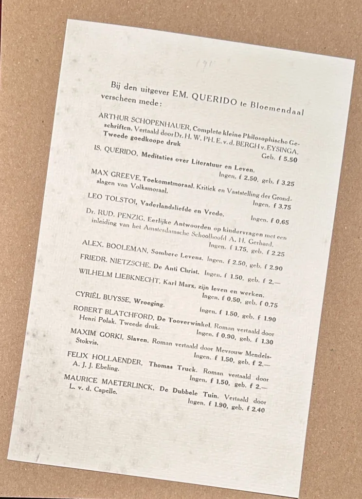 Hans Oldewarris, Uitgeverij Em. Querido van 1902 tot 1915. Amsterdam, Uitg. De Buitenkant, 2026. Aflevering van ‘Uitgelezen boeken. Katern voor boekverkopers en boekenkopers’. Jaargang 21, nummer 3, maart 2026. 32 p. Een abonnement op ‘Uitgelezen boeken’ kost € 30,- per jaar. De losse nummerprijs voor deze aflevering bedraagt 10 euro.