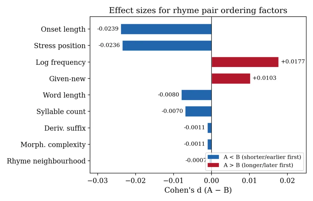 Van de negen factoren die ik testte — woordlengte in termen van letters en van lettergrepen, woordfrequentie (hoe vaak komt het woord uperhaupt voor), klemtoonpositie, de lengte van het deel van het woord dat niet rijmt (de ‘onset’), rijmbuurtgrootte (hoeveel verschillende woorden rijmen er eigenlijk op deze woorden), complexiteit (hoeveel voor- en achtervoegsels zitten er in het woord), en of het woord al eerder in de tekst was gebruikt — bleken er zeven een effect te hebben. Het eerste rijmwoord is gemiddeld iets korter, iets frequenter, heeft iets vroegere klemtoon en een iets kortere onset. Maar de effecten zijn heel erg klein. Bij 2,4 miljoen rijmparen (want zoveel had ik er gevonden) is zelfs het kleinste verschil statistisch significant.