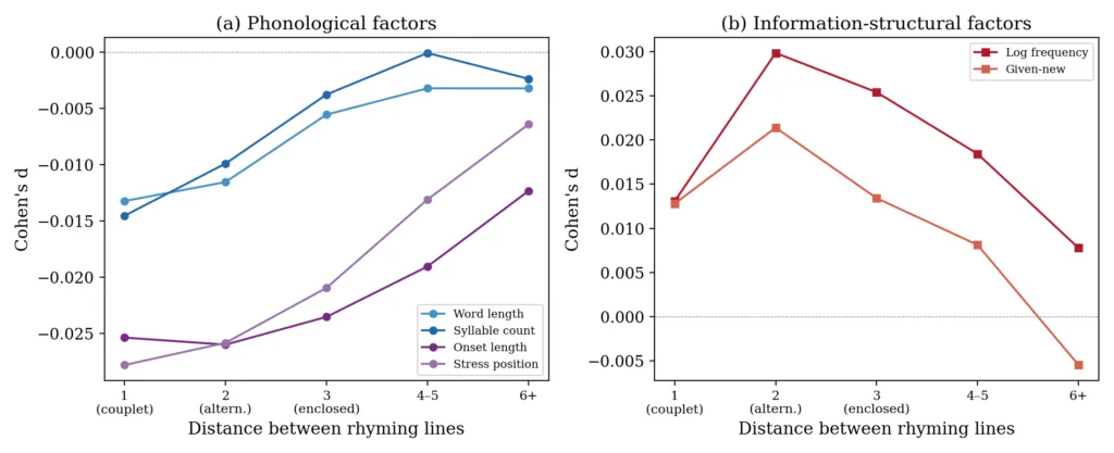 Toch zit er een verrassend patroon in al die kleine effectjes. De factoren splitsen zich namelijk in twee groepen die verschillend reageren op de afstand tussen de rijmregels. Factoren die iets te maken hebben met de klank van het woord (‘fonologische factoren’ zoals woordlengte, klemtoon, onset) zijn het sterkst als de rijmwoorden vlak bij elkaar staan, in een rijmpaar als AABB. Maar frequentie en de vraag of het woord al eerder voorkwam zijn juist het sterkst bij gekruist rijm (ABAB), als er een regel tussen zit. Het frequentie-effect is bij gekruist rijm zelfs meer dan tweemaal zo sterk als bij gepaard rijm.