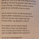 •• Uit Tussen vreemden, de tweede bundel van Laura Mijnders. Date zijn schort valt over zijn nog jongensachtigeborstkas, hij roert in pannen alsof zijn levenervan afhangt, terwijl hij zachtjes neurietplant ik me welwillend op een kruk aan de andere kant van het kookeilandzegt hij plots: muhammara, een saus die meherinnert aan hoe mijn moeder met haarkromgetrokken rug … [Lees meer...] overLaura Mijnders • Date