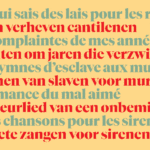 Door Wouter van der Land ‘“La chanson du mal-aimé” van Apollinaire ken ik al meer dan een halve eeuw. Ik ontdekte het gedicht in de bekende Franse schoolbloemlezing van Lagarde & Michard. Wat me vooral trof was de melodieuze toon en de speelse beeldspraak. Toen ik jaren later de dichteres Christine D’haen leerde kennen, verklapte die mij dat het een van haar … [Lees meer...] overVan vormvast Frans naar rijmend Nederlands